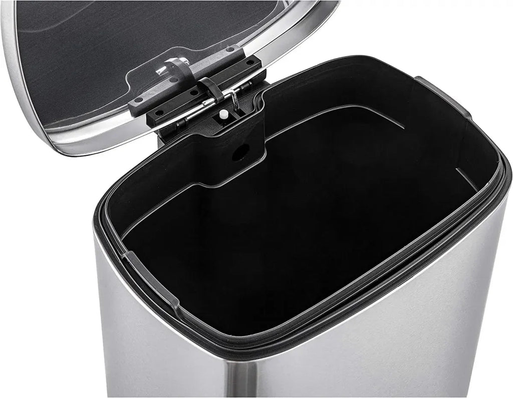 Lixeira retangular em inox, com pedal e tampa articulável, com capacidade de 12 litros. Acabamento em inox escovado. Possui cesto