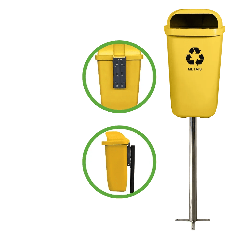 A Lixeira Papeleira Com Poste 50 Litros é fabricada em Polietileno de Alta Densidade (PEAD) ou Polipropileno (PP) e aço inox galvanizado.